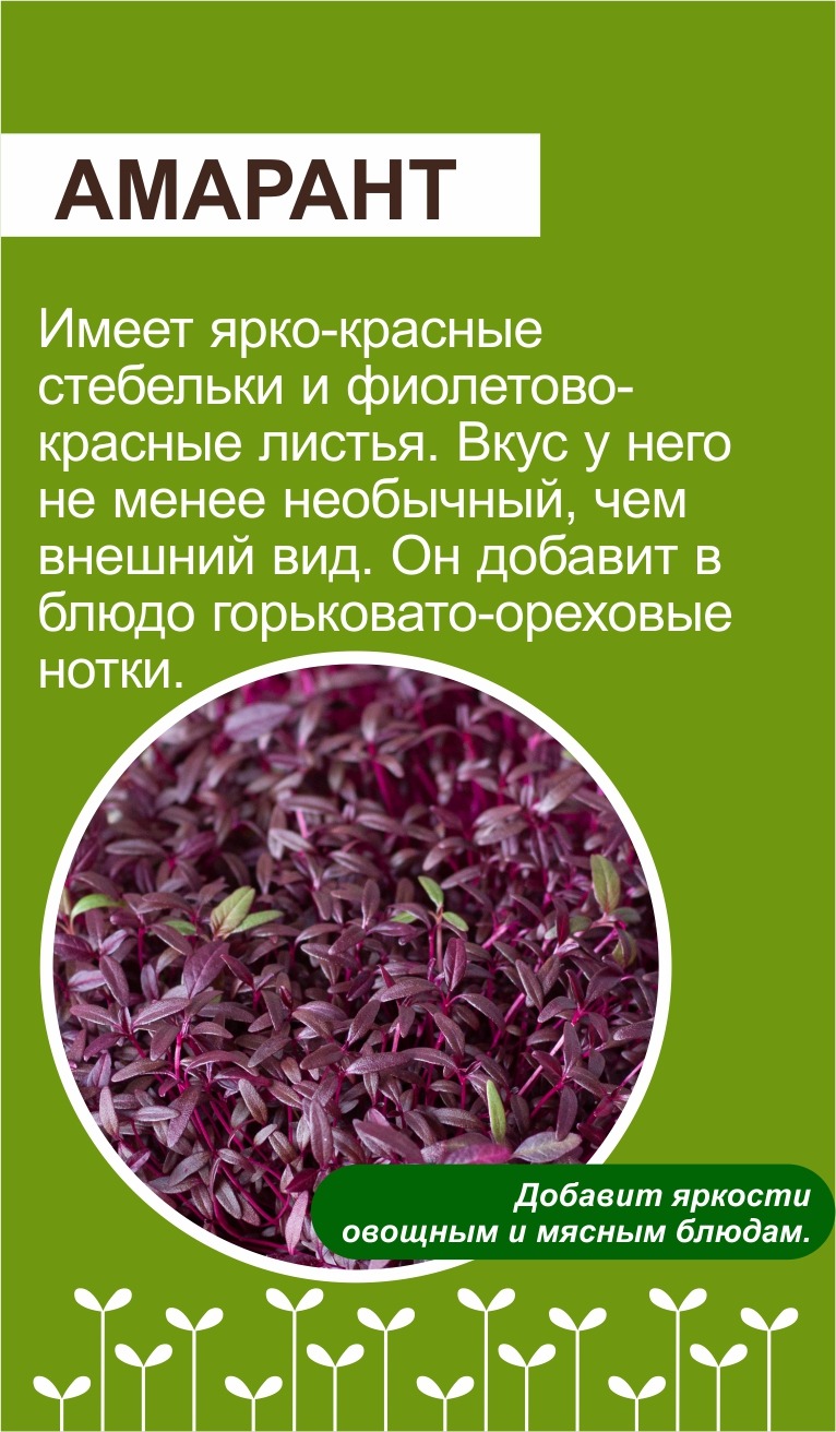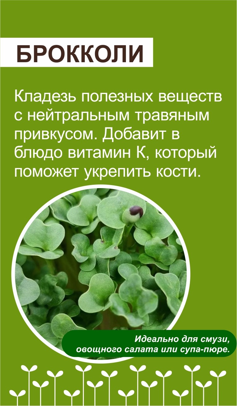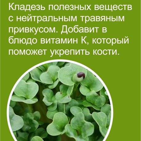 Все виды микрозелени обогащены рекордным количеством витамина С. Также в них содержатся витамины группы В, Е, РР, фолиевая кислота, железо, фосфор и магний.